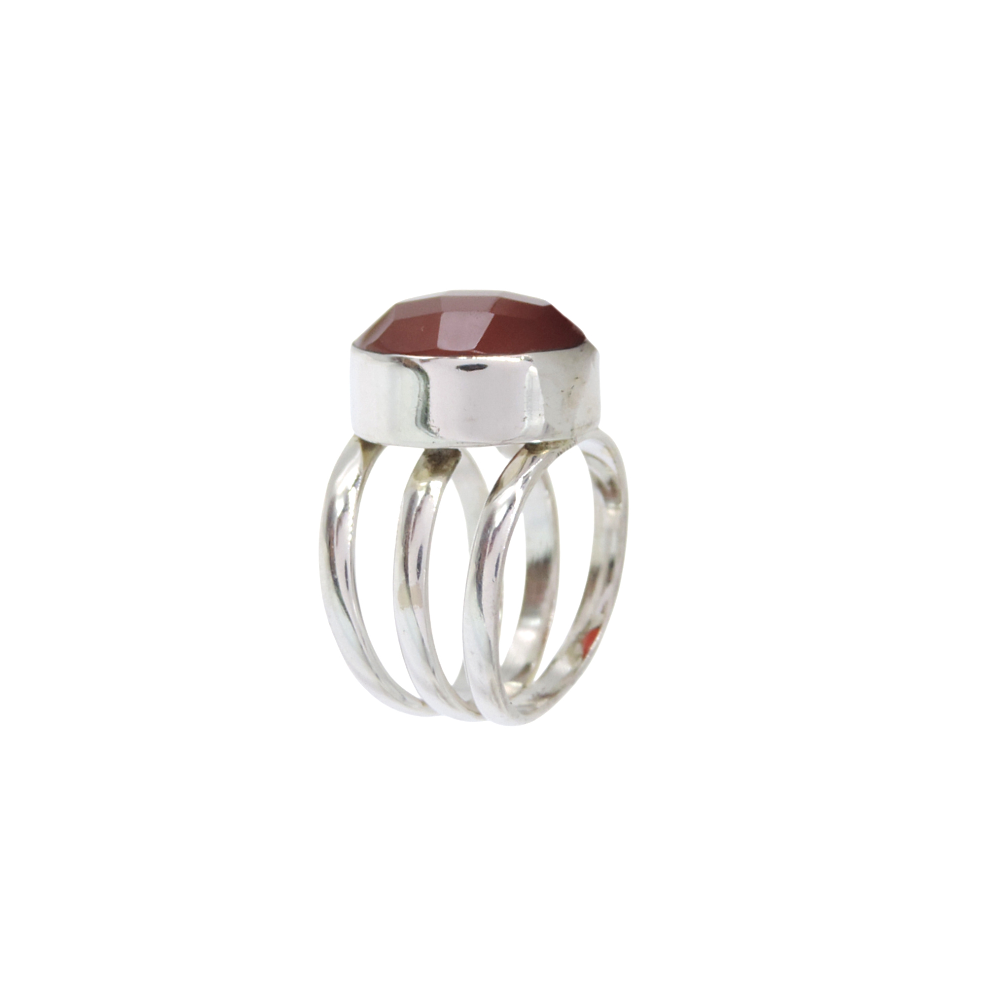 Faceted Carnelian in bezel setting with architectural split-band design. Clean polished finish with contemporary styling. Three-band structure creates visual depth.