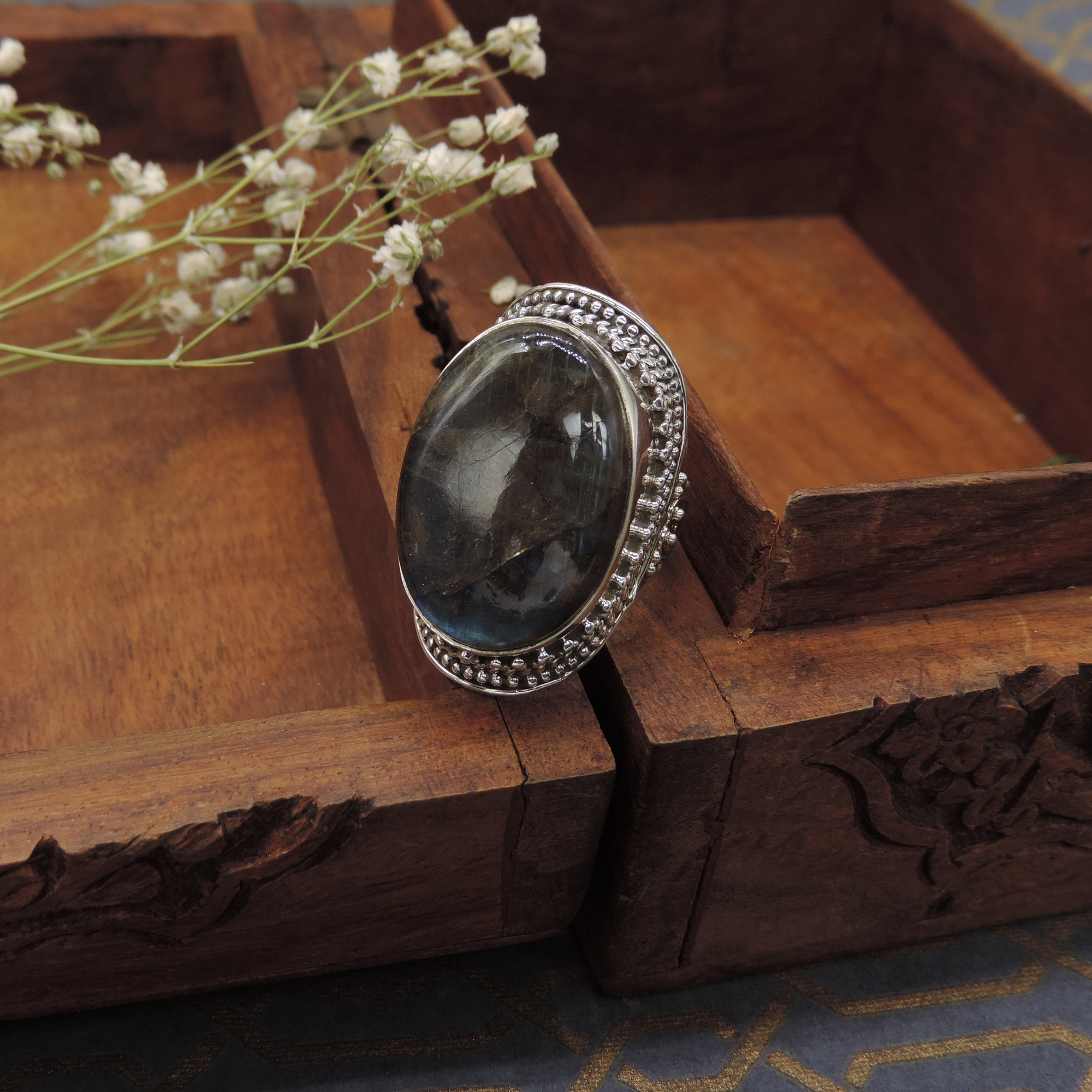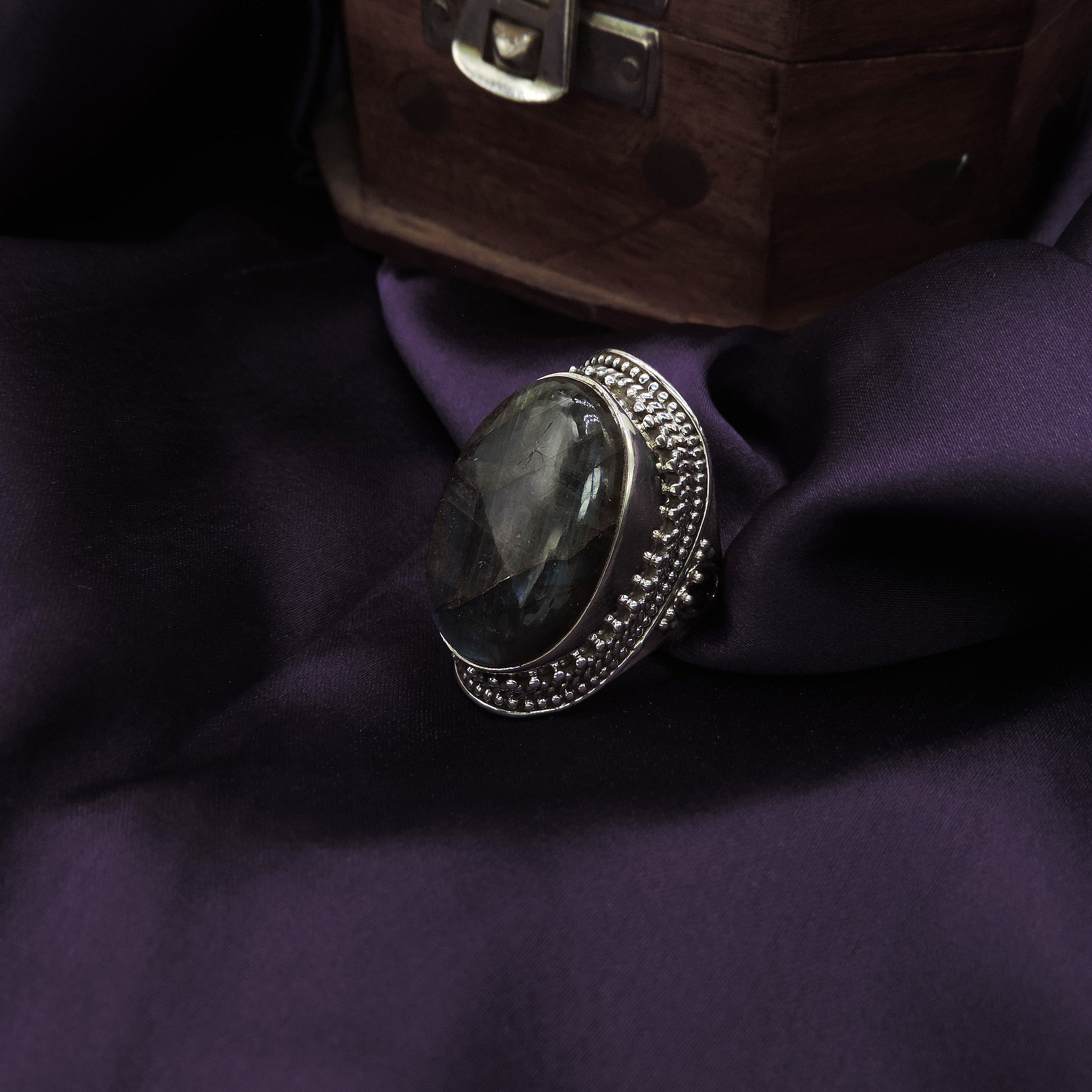 Large oval cabochon Labradorite in smooth bezel setting with granulation halo. Dark greenish-grey stone with natural inclusions. Statement ring with oxidized detailing.