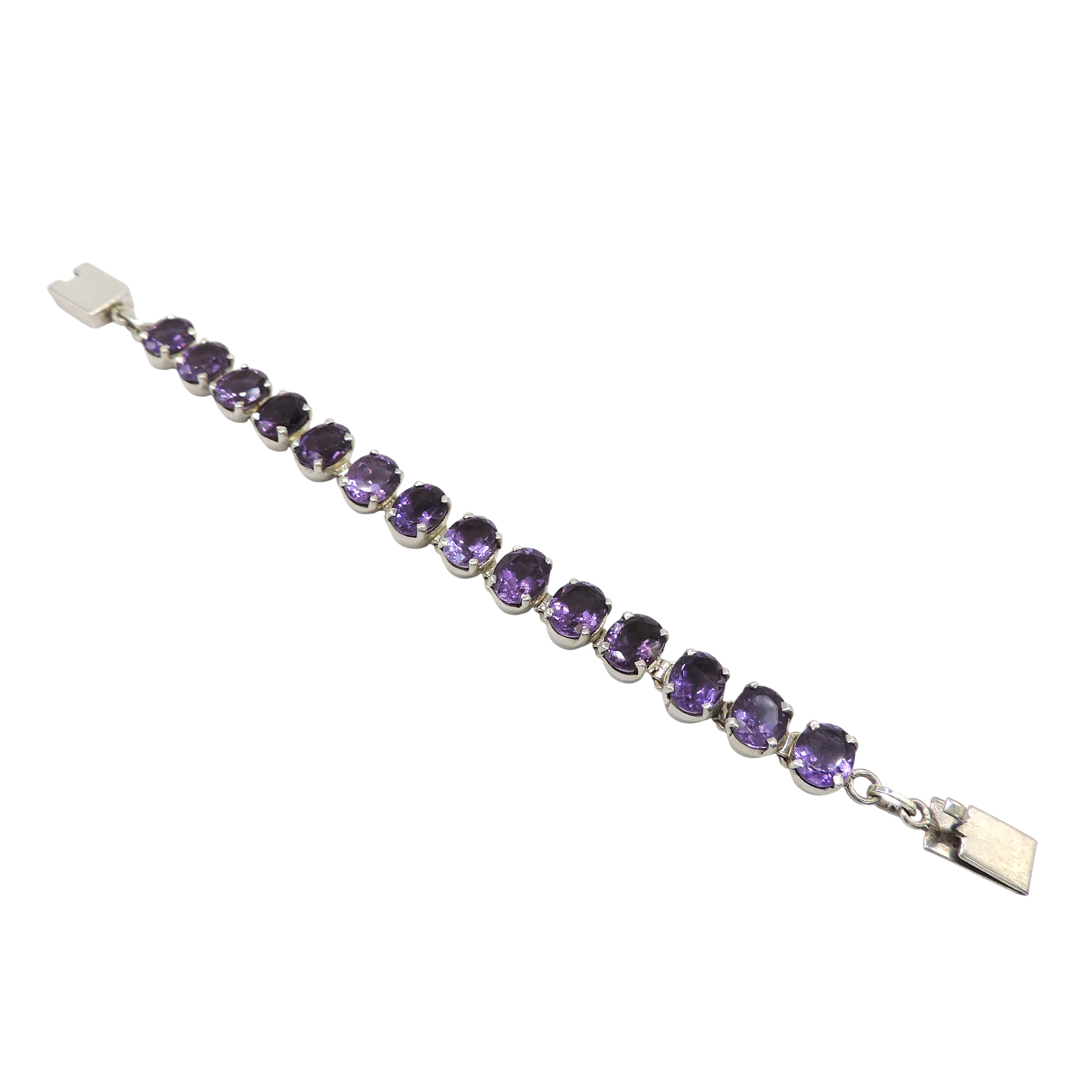 Oval amethyst faceted gemstones in prong settings with continuous link design. Purple gemstones graduating in tone on polished sterling silver. Handcrafted tennis bracelet with box clasp closure.