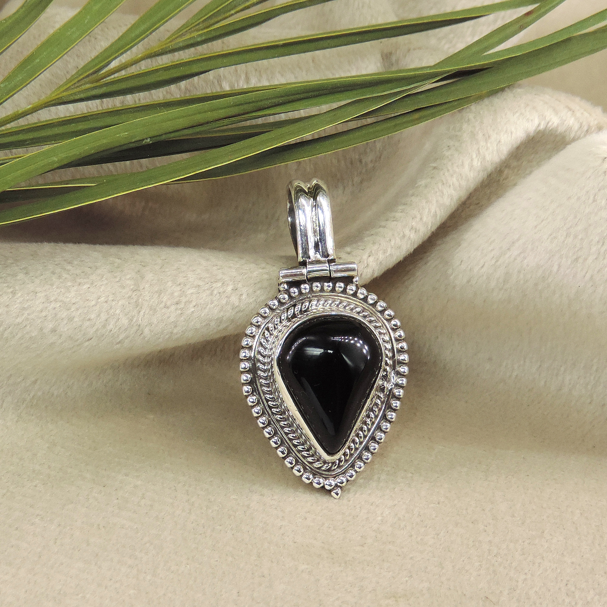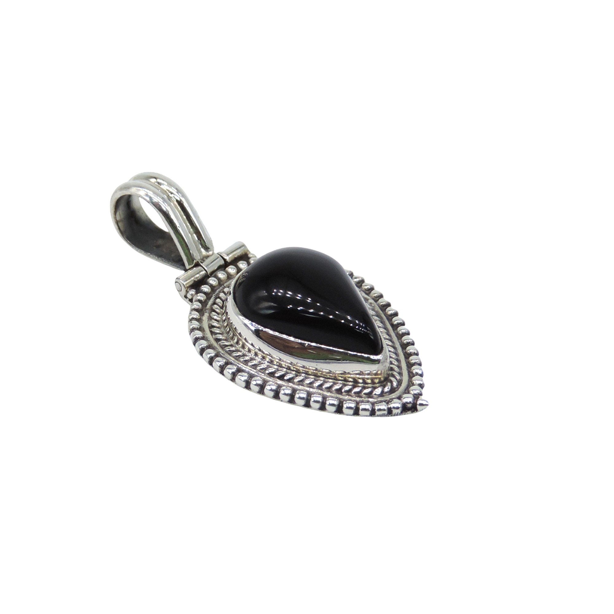 Teardrop Black Onyx cabochon in rope bezel with double granulation borders. Black gemstone with hinged bail and oxidized sterling silver accents. Traditional pendant.