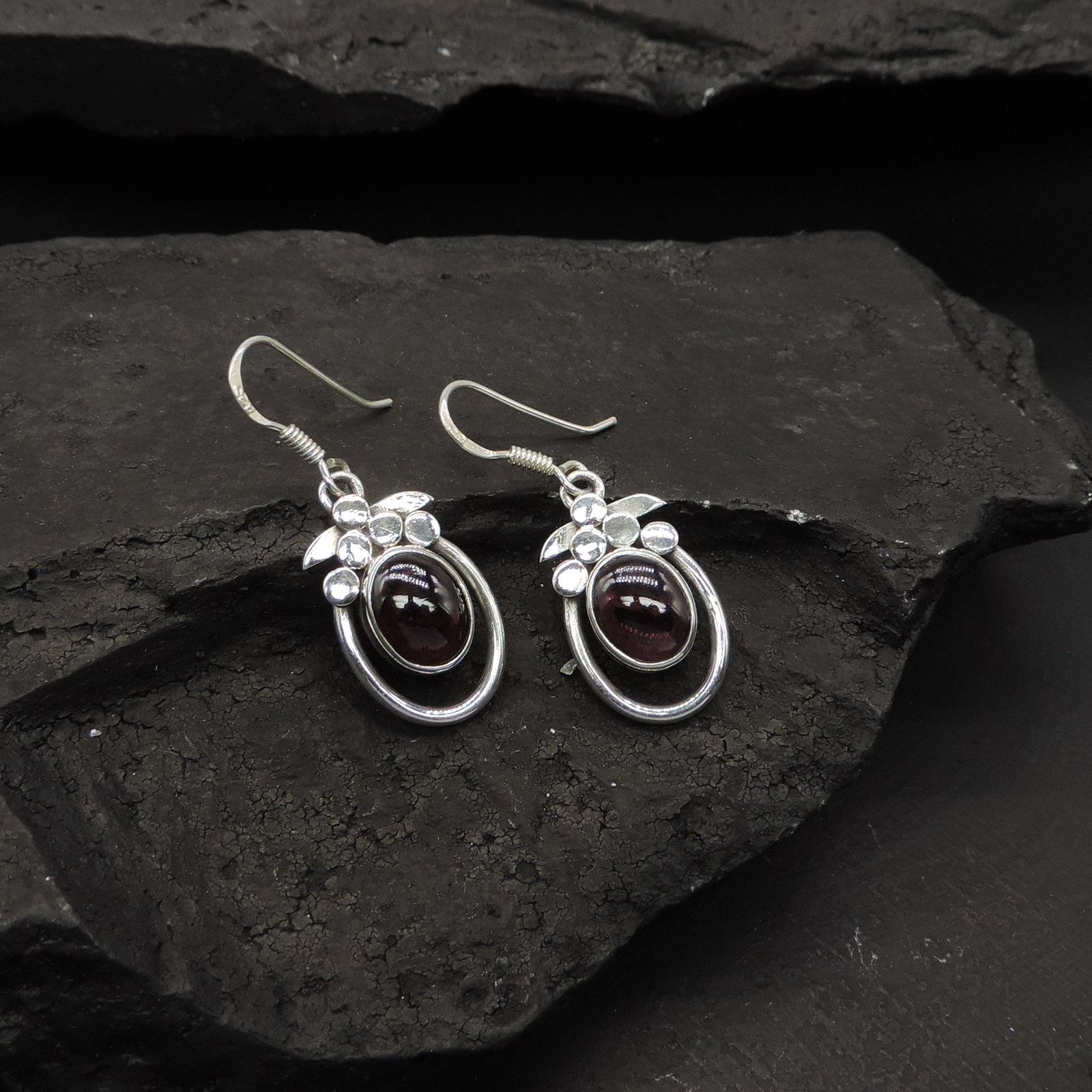 Oval garnet cabochons in bezel settings with leaf cluster accents above oval hoop frames. Deep red gemstones with polished sterling silver botanical detailing. Handcrafted dangle earrings with french hook closures.