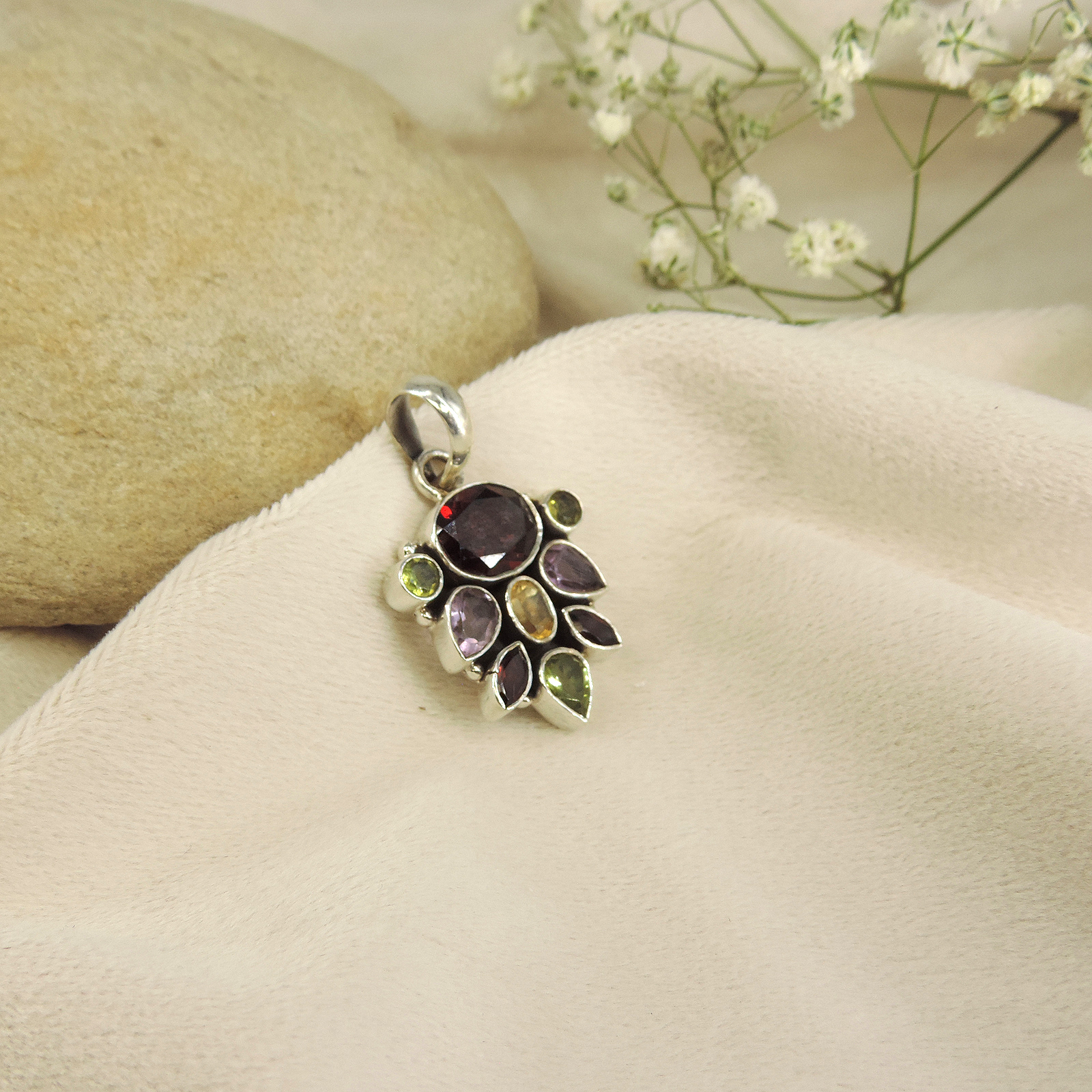 Faceted multi-gemstone cluster in floral design with bezel settings. Central garnet surrounded by peridot, amethyst, citrine stones. Vibrant handcrafted sterling silver jewellery.