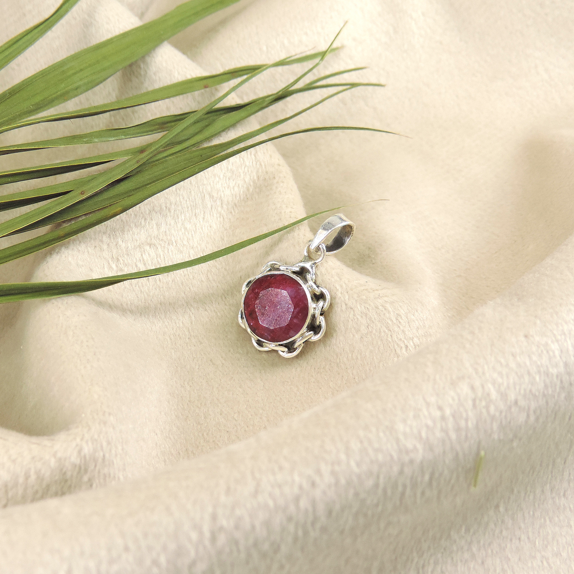 Round Quartz cabochon in bezel setting with decorative scalloped edge frame. Deep red gemstone with oxidized sterling silver accents. Compact delicate pendant.