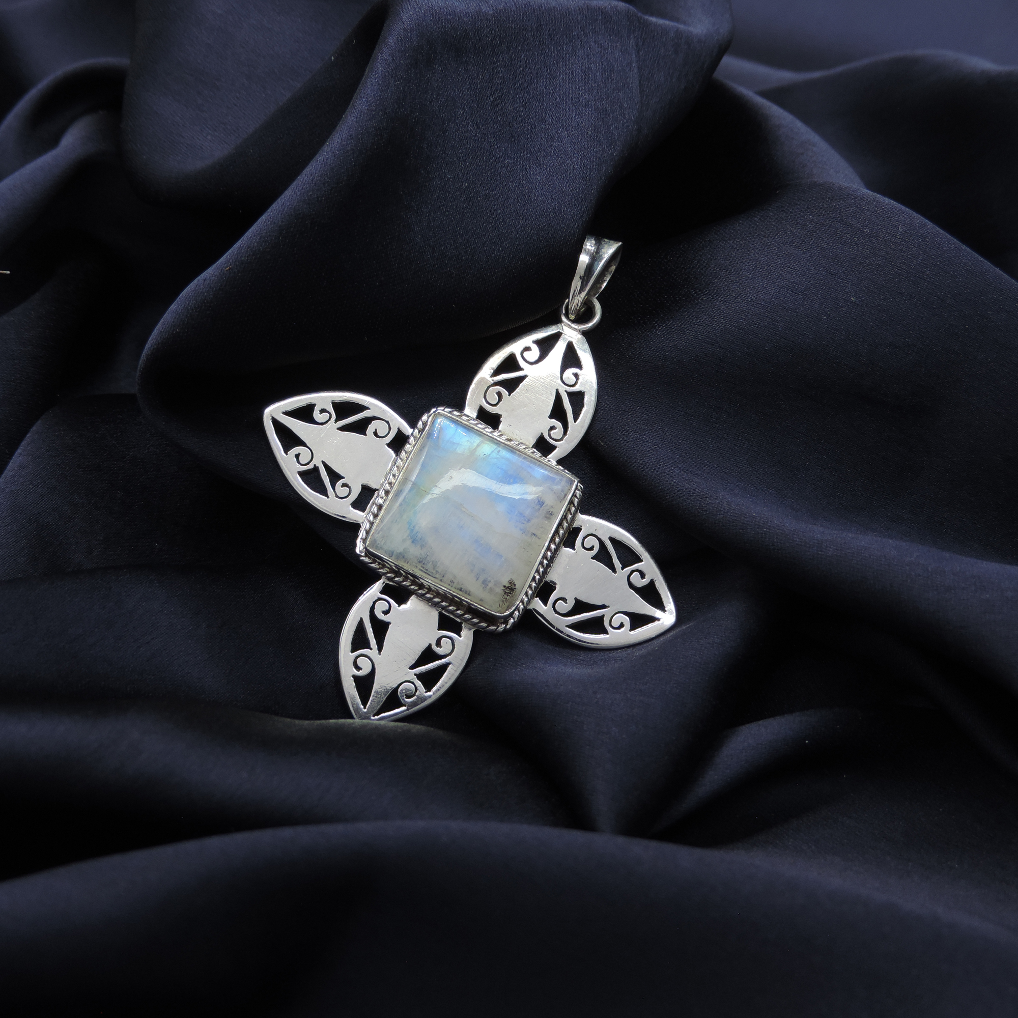 925 Sterling Silver Rainbow Moonstone Cross Pendant