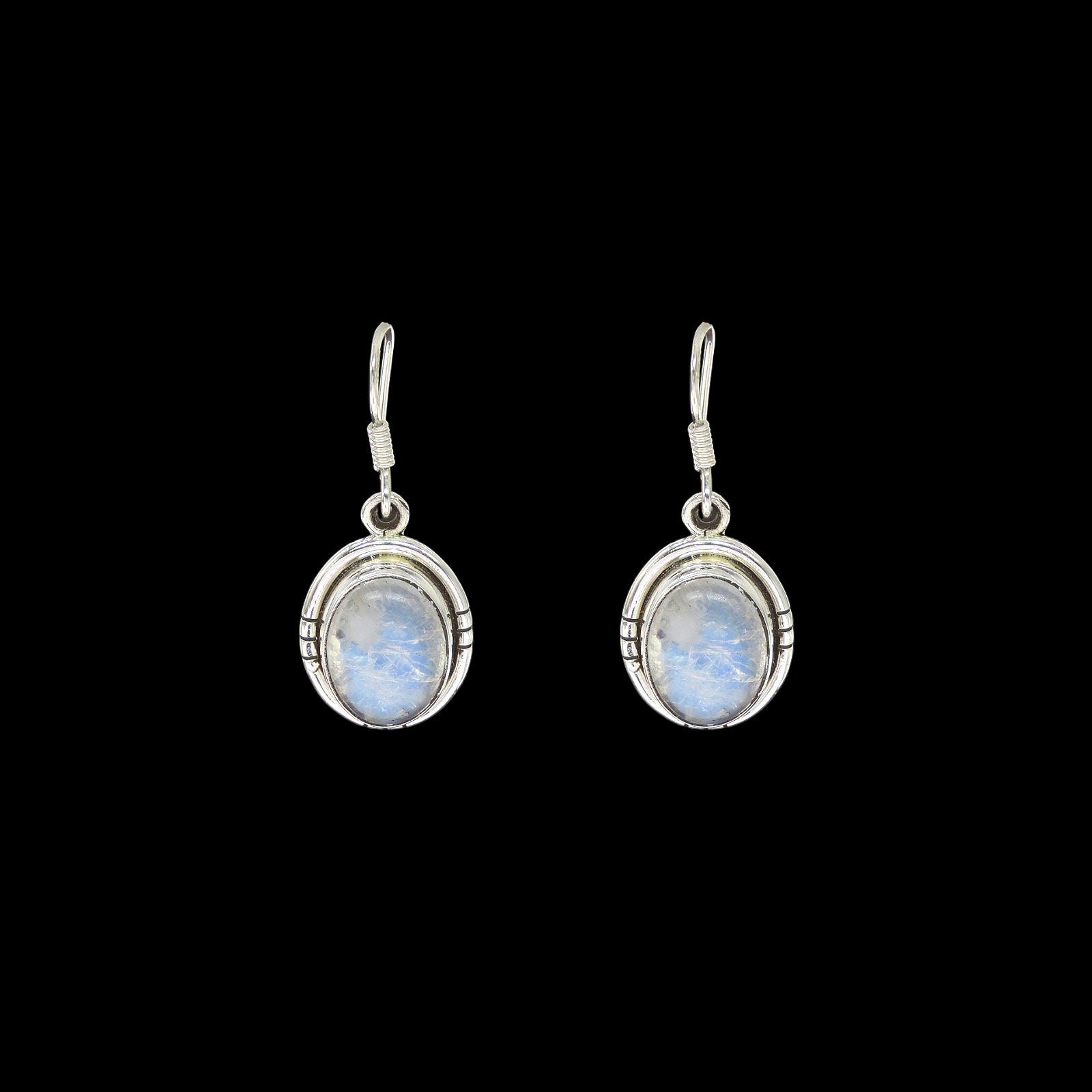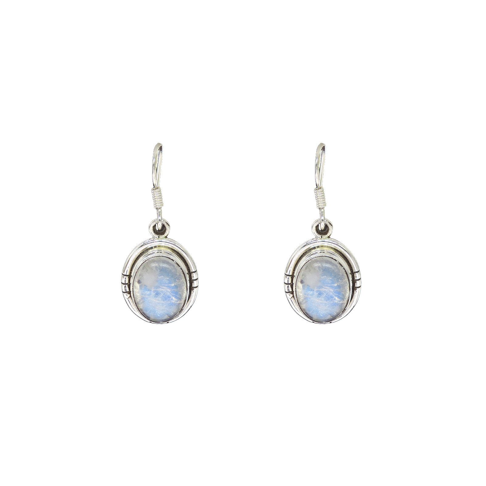 Oval rainbow moonstone cabochons in bezel settings with stepped bezel frames and notched side detailing. Translucent gemstones with blue adularescence. Handcrafted dangle earrings with french hook closures.