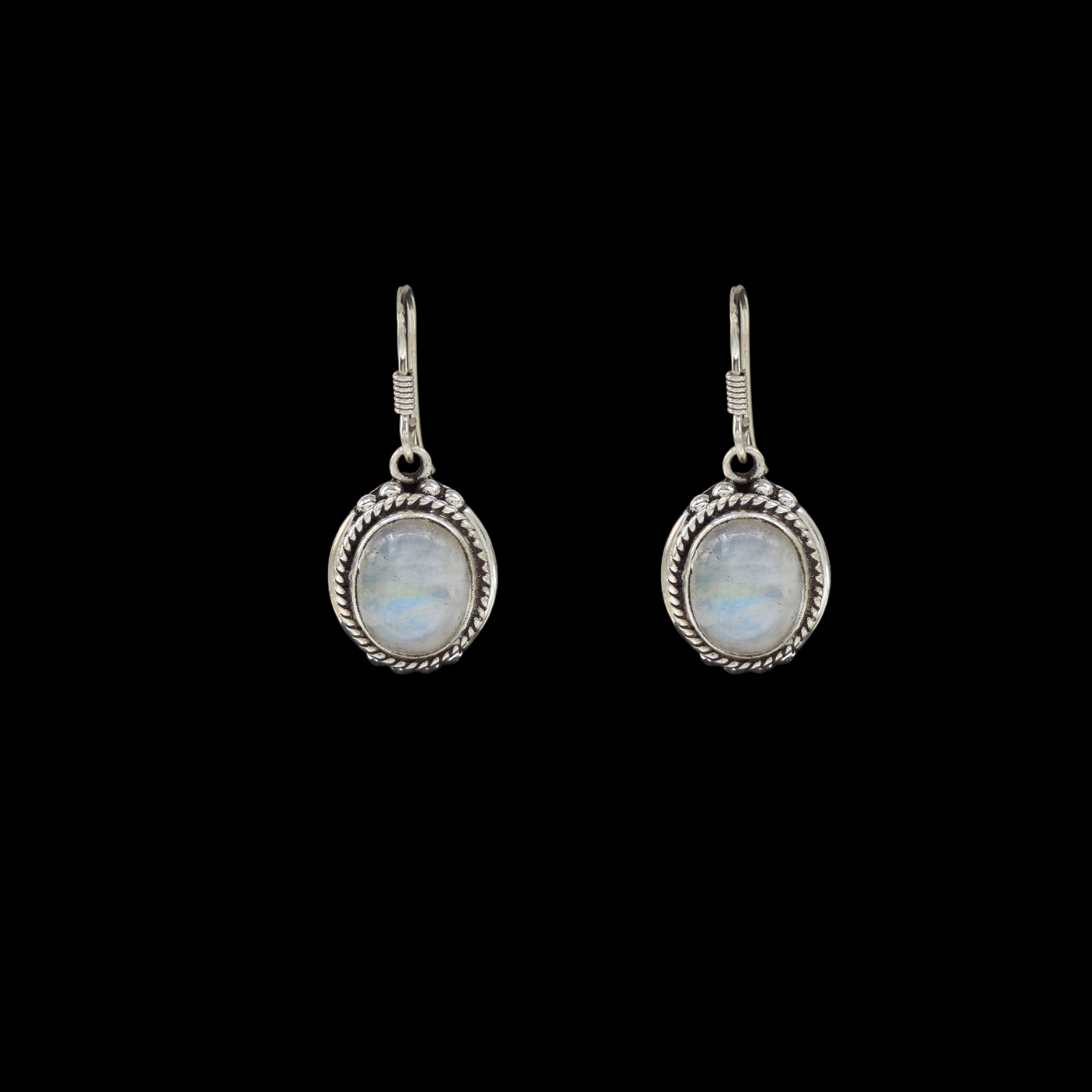 Oval rainbow moonstone cabochons in bezel settings with rope wire border and granulation accents at top. Translucent gemstones with blue adularescence. Handcrafted dangle earrings with french hook closures and oxidized detailing.