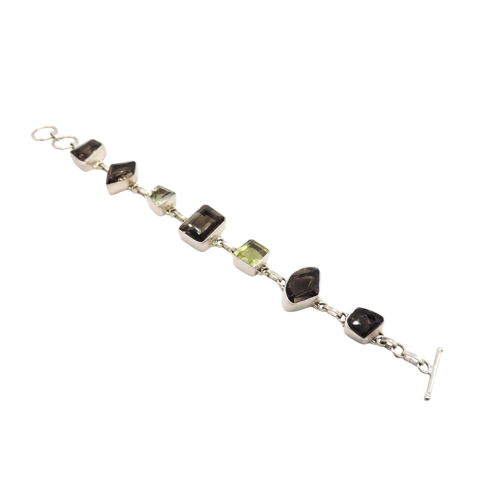 Faceted smoky quartz and citrine gemstones in varied geometric shapes with bezel settings. Brown and yellow-green stones connected with sterling silver links. Handcrafted bracelet with toggle clasp closure.